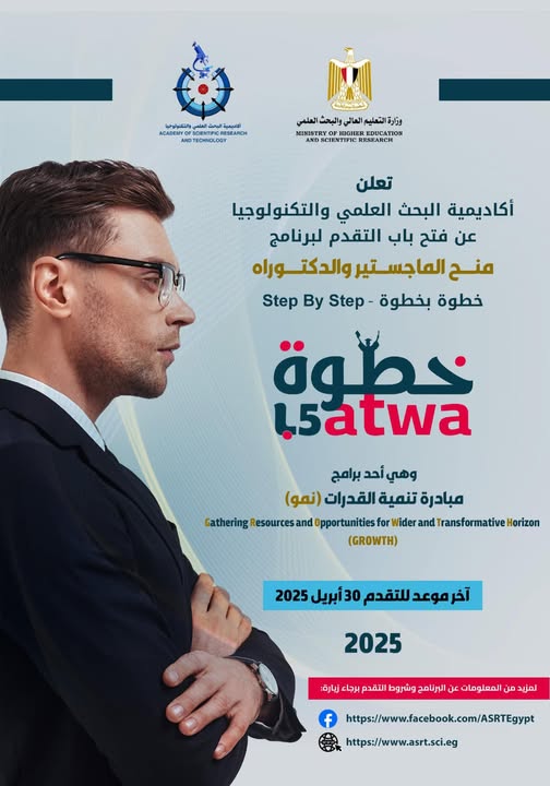 تعلن أكاديمية البحث العلمي والتكنولوجيا أنه اعتبارا من اليوم حتى 30 أبريل تم فتح باب التقدم لبرنامج ” خطوة بخطوة Step By Step ” , وأوضحت الدكتورة جينا الفقي، القائم بأعمال رئيس أكاديمية البحث العلمي والتكنولوجيا أن برنامج “خطوة بخطوة” ضمن أنشطة البرنامج الرئيسي الجديد لتنمية ودعم القدرات (نمو GROWTH)،