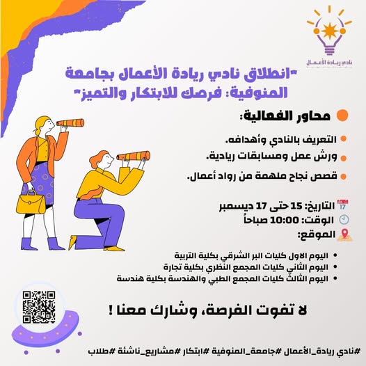هل أنت طالب طموح مهتم بتطوير مهاراتك الريادية؟ انضم إلينا في الندوة الافتتاحية لنادي ريادة الأعمال بجامعة المنوفية!