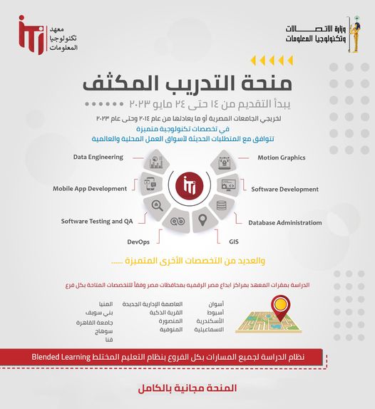 يُعلن معهد تكنولوجيا المعلومات عن فتح باب التسجيل لمنح التدريب المكثف في تخصصات تكنولوجية متميزة لخريجي الجامعات المصرية من عام ٢٠١٤ وحتى عام ٢٠٢٣ بمقر المعهد بالمحافظات التالية: – مركز إبداع مصر الرقمية بمحافظة بني سويف: – Software Engineering Fundamentals…